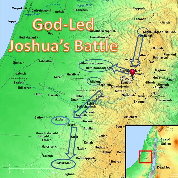 God appeared to Joshua, and said to him. “Do not be afraid of them, for I have given you victory over them. Not a single one of them will be able to stand up to you.” With the faith in God, Joshua traveled all night from Gilgal and took the Amorites armies by surprise. The LORD threw them into a panic, and the Israelites started slaughtering greater numbers of them. The great battle went on, and Joshua prayed to God to stop the sun and the moon while the battle was going. What a prayer it was out of an absolute faith! The sun stood still over Gibeon and the moon stayed over the Valley of Aijalon while the Israelites were fighting. (Two cities are circled in the middle of the map: one on right [east] and one left [west]).
