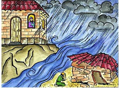 After this, Jesus talked about faith, and asked them build their faith on the solid ground of Jesus.  Jesus gave a parable:  “Anyone who listens to my teaching and follows it is wise, like a person who builds a house on solid rock. Tough the rain comes in torrents and the floodwaters rise and the winds beat against that house, it won’t collapse because it is built on bedrock.  But anyone who hears my teaching and doesn’t obey it is foolish, like a person who builds a house on sand.  When the rains and floods come and the winds beat against that house, it will collapse with a mighty crash.”    All of the disciples nodded.