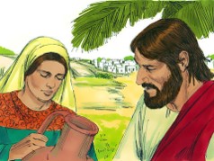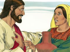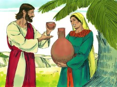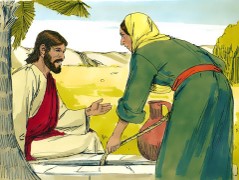 Jesus, tired from the long walk, sat wearily beside the well about noontime. His disciples had gone into the village to buy some food. He was alone at the well. Soon a Samaritan woman came to draw water, and Jesus said to her,