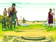 After the long journey, finally, Jacob was arriving in the land of the East near Haran. In the distance, he saw a large flock of sheep and goats with shepherds. He ran to meet the shepherds. As getting close, he saw three flocks of sheep and goats laying in an open field beside it, waiting to be watered. But a heavy stone covered the mouth of the well.